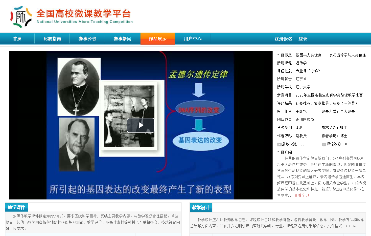 在全面实施“六卓越一拔尖”人才培养计划及一流本科专业和课程建设“双万计划”的时代背景下,为促进课程教师专业发展、教学模式改革创新和教学经验交流,教育部高等学校生物学相关专业教学指导委员会组织开展了“2020年全国生命科学类微课教学比赛”。6776永利集团王红艳副教授主讲的《基因与人类健康——表观遗传学与人类健康》荣获三等奖。