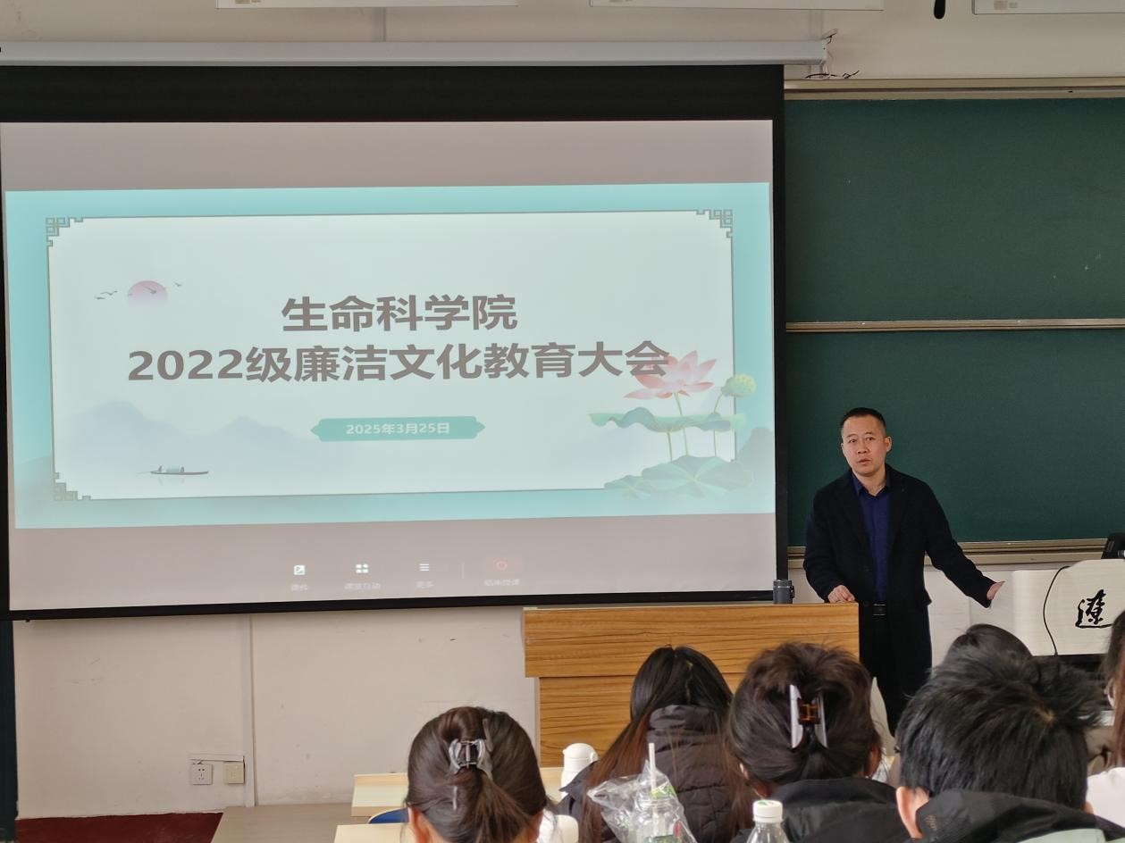 2025325日,6776永利集团党委副书记兼纪委书记、副院长,2022级本科生辅导员杨鸣老师在东阶梯302面向2022级本科生召开廉洁文化教育大会,2022级全体同学参加会议。