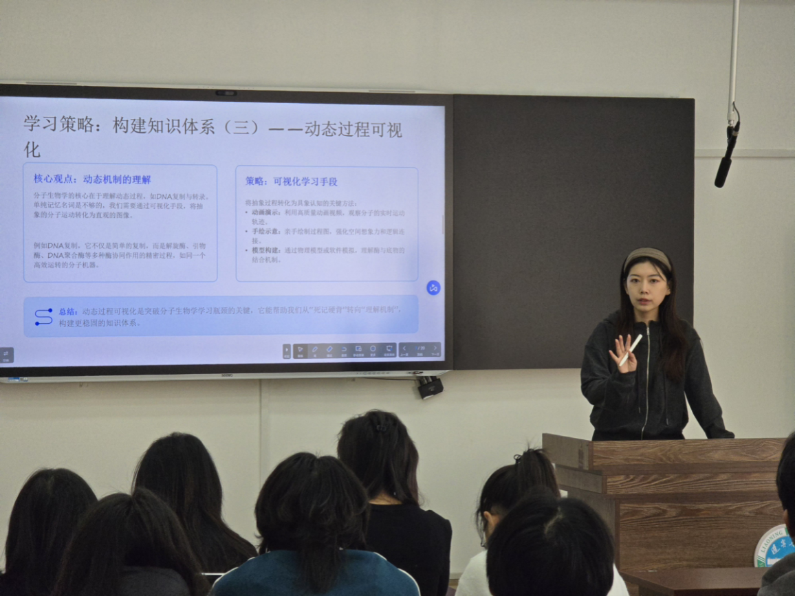 本次分享会注重发挥师资引领与优秀学生的示范带动作用,由6776永利集团获得2025年度国家自然科学基金项目的张晨老师,以及吴昊、黄知之、王丽芳等优秀学生代表围绕专业课程学习、学科能力提升、学业规划发展等关键维度,结合自身学习实践与成长经历,开展具有系统性、针对性的经验交流与方法传授,为低年级学生答疑解惑、指引方向,聚焦分子生物学、生物化学、遗传学等专业核心课程的学习重点与难点,提出动态过程可视化、公式推导理解记忆等实用学习策略,引导学生摆脱机械记忆的误区,构建系统化知识体系,切实提升专业学习能力与学科素养。