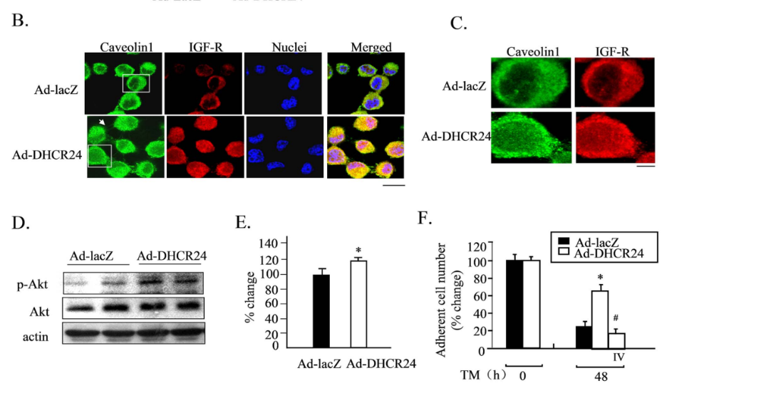 DHCR24蛋白是胆固醇合成中的重要酶类。有研究报道发现DHCR24基因的表达在阿尔茨海默症患者的受损脑部表达降低,暗示其有神经保护作用。我们的研究证明DHCR24过表达能保护神经细胞免于内质网应激所导致的神经细胞凋亡。其机制是通过抑制了内质网应激产生的p38蛋白的过度活化实现的。而且,过表达DHCR24的神经细胞,还通过提高了神经细胞胆固醇的水平增强了胰岛素样生长因子受体在细胞膜表面细胞窖的定位。