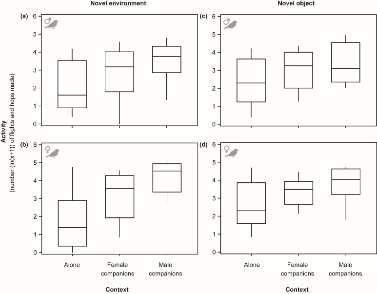 群居动物可以相互影响对方的行为,导致行为的频率或类型发生变化(社交促进),或趋同于大多数邻居表现出的行为水平(社交从众)。促进效应和从众效应可以起到减少直接竞争和/或促进社会协调的作用。个体之间相互影响的程度取决于同伴的身份和特征。为了研究社交同伴对个体行为的影响,我们比较了灰文鸟在三种社交环境(单独、三个雌性同伴或三个雄性同伴)和两种条件(新奇环境和新奇对象测试)下的活动行为。在所有测试中,灰文鸟的活动行为具备一致性和可重复性,表明活动性可以作为反映个体个性特征的行为指标。此外,个体的活动行为随着社交环境的改变发生了系统的变化。研究发现,无论是雌性灰文鸟还是雄性灰文鸟,均在有同伴存在时较独自测试时更为活跃,尤其是当雄性同伴存在时,这种改变更为明显。这项研究表明社会同伴对灰文鸟活动行为有促进效应,并且这种促进效应与同伴的性别有关。