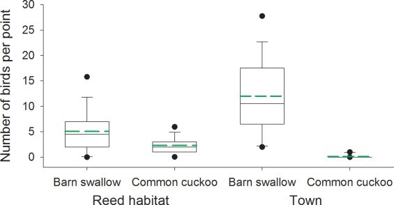 图 1 在芦苇和乡镇栖息地家燕和大杜鹃的数量比较