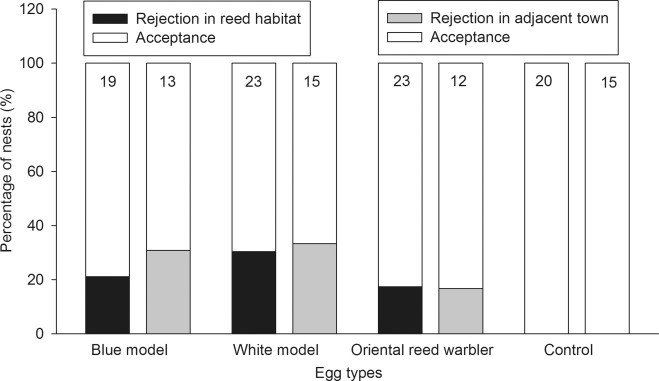 图2 在两种栖息地繁殖的家燕的卵拒绝率(%)比较。