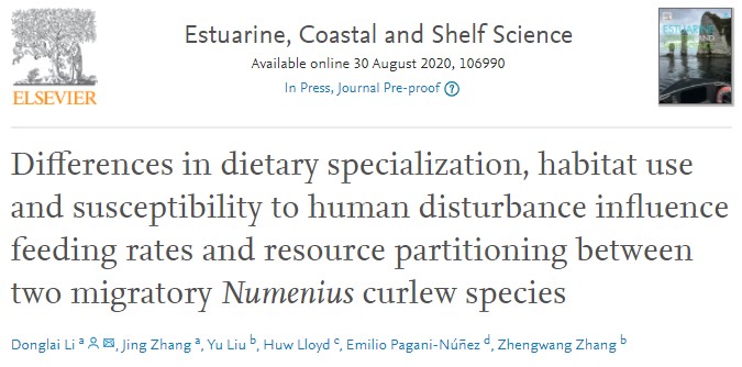该研究以“Differences in dietary specialization, habitat use and susceptibility to human disturbance influence feeding rates and resource partitioning between two migratory Numenius curlew species”为题,于2020年8月30日在国际学术期刊《Estuarine, Coastal and Shelf Science》在线发表。永利官网李东来副教授为本论文第一作者和通讯作者。本研究得到国家自然科学基金(31672316, 31911540468和31301888)和辽宁省自然科学基金(2019‐MS‐154)的资助。