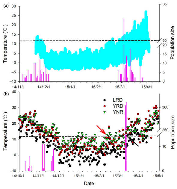 丹顶鹤迁徙与环境温度变化(螃蟹活动强度)的关系