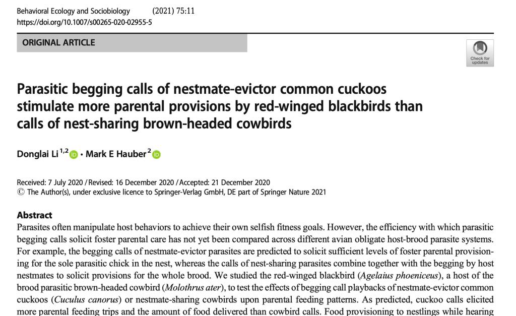 近日,我院李东来副教授和美国伊利诺伊大学巢寄生行为学著名专家Mark E Hauber教授联合在行为学顶级期刊Behavioral Ecology and Sociobiology上发表题为“Parasitic begging calls of nestmate-evictor common cuckoos stimulate more parental provisions by red-winged blackbirds than calls of nest-sharing brown-headed cowbirds”的重要论文,是课题组巢寄生研究又一突破性研究进展。永利官网作为第一署名单位,李东来老师为第一作者兼通讯作者。