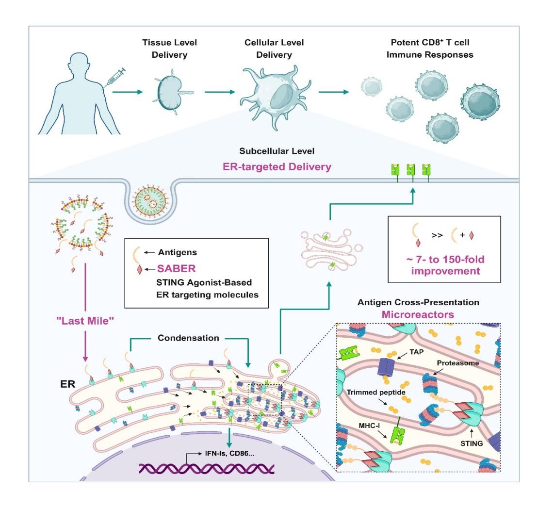 研究团队以干扰素基因刺激蛋白(STING)蛋白为靶点,开发了靶向STING蛋白的高亲和力内质网靶向分子(STING agonist-based ER targeting molecules,SABER)。该分子的设计实现了双重功能:第一是偶联多肽后可将抗原精准靶向至内质网,并且聚集抗原,形成抗原递呈关键酶富集区,促进抗原交叉递呈;第二是SABER拥有的STING激动剂的功能,可显著激活STING下游通路,增强佐剂效应。
