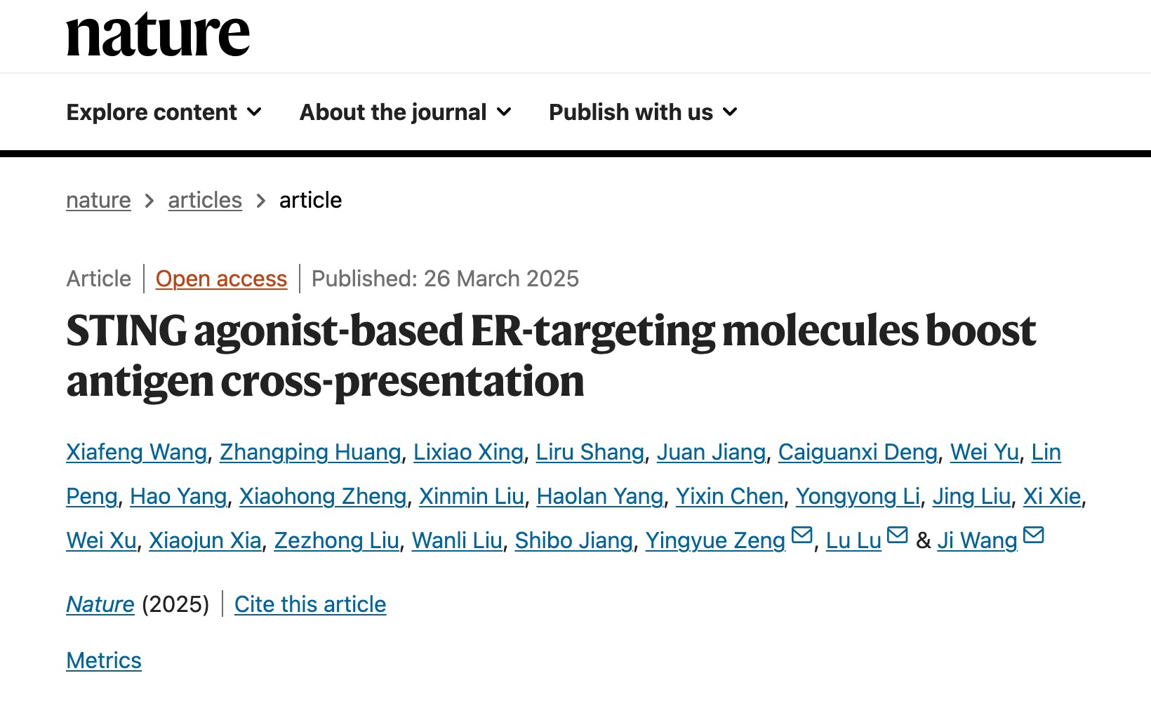 2025年3月27日,6776永利集团曾颖玥副教授与中山大学第一附属医院王骥研究员、复旦大学陆路研究员的合作研究论文STING agonist-based ER targeting molecules boost antigen cross-presentation在国际顶级期刊《自然》(Nature)上在线发表,曾颖玥副教授为本文共同通讯作者。