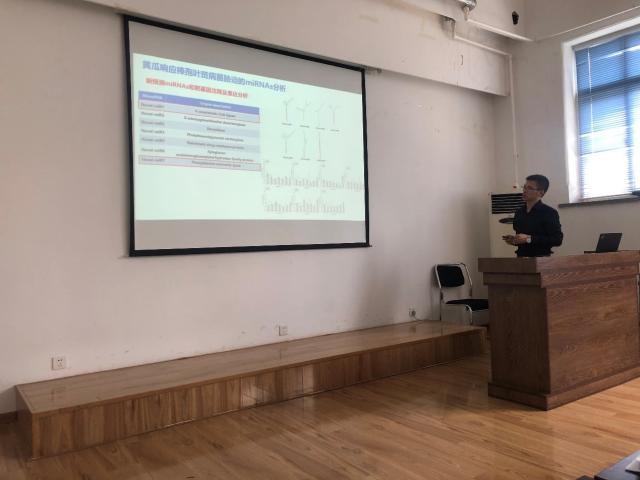 王翔宇博士做了主题为《黄瓜响应棒孢叶斑病菌侵染的转录组和microRNAs解析》的学术报告。王翔宇博士利用高通量测序技术,研究了接种棒孢叶斑病菌后抗病黄瓜品种津优38号转录组和microRNA的变化,鉴定到响应棒孢叶斑病菌侵染的关键miRNAs和差异表达基因;并利用黄瓜瞬时过表达技术和TRV诱导的STTM-miRNA沉默技术等手段,进一步证实这些关键miRNAs及其靶基因在黄瓜防御棒孢叶斑病菌侵染中的作用,揭示木质素等次生代谢产物快速合成积累是黄瓜抗棒孢叶斑病的重要机制之一。