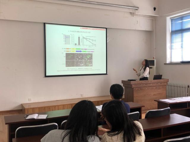 李铁梅博士做了主题为《葡萄VvNAC72转录因子调控乙二醛酶表达与抗霜霉病的功能研究》的学术报告。李博士从事葡萄抗霜霉病相关基因功能研究,在葡萄全基因组中鉴定了9个乙二醛酶基因,利用具有乙二醛酶I功能的蛋白VvGLYI-4,在无核白葡萄中发现转录因子VvNAC72,该转录因子能够特异结合VvGLYI-4基因的启动子,并抑制VvGLYI-4的表达。过表达VvNAC72能够增强转基因葡萄对霜霉菌的抗性。