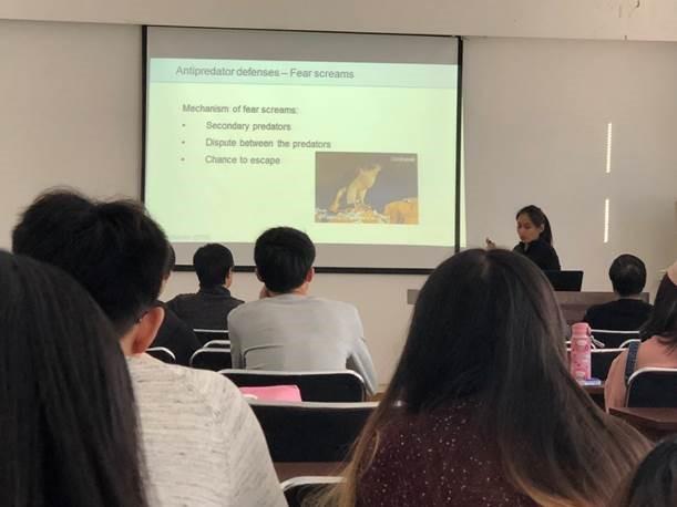 蒋一婷博士进行了主题为《鸟类的惊飞行为与保护》的学术讲座。其主要研究方向为生态系统与进化,以第一作者发表了SCI论文2篇,其中一篇为TOP期刊。蒋一婷博士以欧洲鸟类为基础,探究了几个因子与鸟类反捕食行为中的逃跑行为的关系。结果表明FID短的物种,种内遗传变异也相对越低,与受胁物种相比,其近缘种的惊飞行为更短,同时FID与物种进化独特性显著正相关;FID长的物种同时承受着更高的氧化压力,即FID长的物种在放弃部分机会成本的同时,也承受着更高的能量成本。报告的最后探究了鸟类反捕食行为会受社会行为的影响,结果表明只有具有集群习性的社群性鸟类FID受集群个体数量影响。