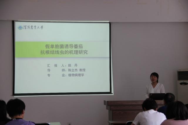 赵丹博士进行了主题为《假单胞菌诱导番茄抗根结线虫的机理研究》的学术报告。其主要从事生物化学与分子生物学方向的研究,近年来以第一作者发表SCI论文2篇。赵丹博士通过田间试验筛选出5株可诱导番茄抗南方根结线虫的生防细菌,并系统的研究了恶臭假单胞菌Sneb821诱导番茄抗南方根结线虫的分子机理,同时利用拟南芥突变体验证了AtSUC2基因在线虫发育中的作用。