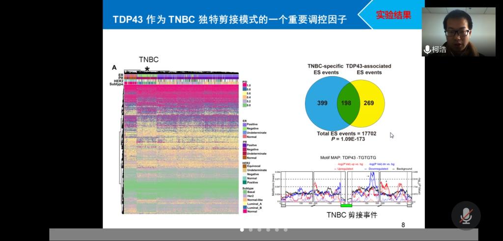 柯浩博士报告题目为《TDP-43在乳腺肿瘤与乳腺发育中的功能及其机制研究》。柯浩博士的研究领域为RNA结合蛋白与乳腺肿瘤,在本次报告中提到:通过大量的生物信息学分析,首次揭示TNBC存在独特剪接模式;进一步结合表达相关性和剪接因子结合序列富集分析,鉴定出TDP-43为TNBC独特剪接模式的重要调控因子;TDP-43在TNBC肿瘤组织中高表达,而且其高表达与TNBC病人预后不良相关;体外与体外实验揭示TDP-43能促进TNBC细胞恶性增殖与转移能力,从而促进肿瘤进程;采用IP-MASS、RIP-seq与RNA-seq等实验技术,还发现TDP-43能结合SRSF3,而且两者协同调控TNBC可变剪接过程;最后,还确定TDP-43与SRSF3能调控PAR3与NUMB基因外显子12剪接而影响TNBC细胞转移与增殖能力。