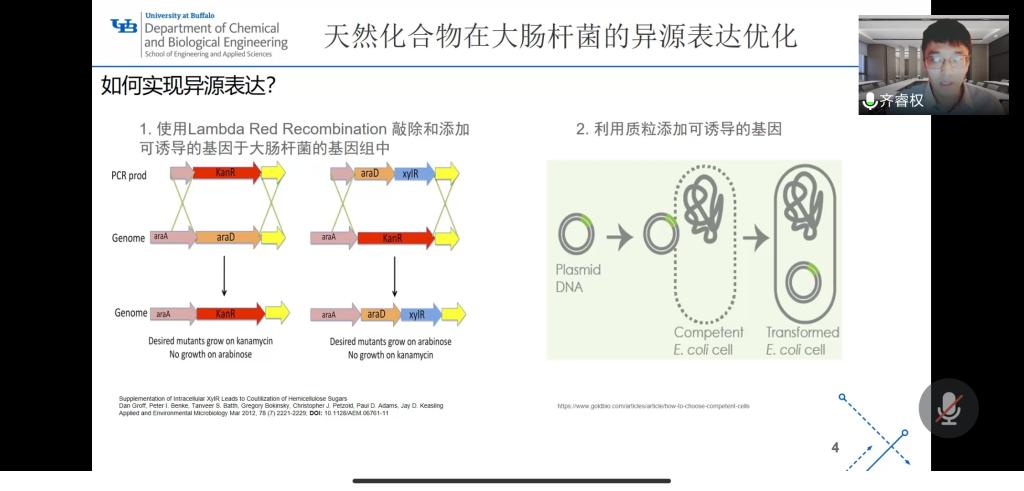 齐睿权博士报告题目为《天然化合物在大肠杆菌中的异源表达优化以及癌细胞靶向DNA疫苗的研发》。报告中,齐睿权博士对以大肠杆菌作为基础开发的新型癌细胞靶向DNA疫苗研究进行了详细的阐述,提到:经实验证明可一步实现人体树突状细胞(DC)的熟化和抗原的传送,该疫苗的抗原载体由一种生物相容性聚合物覆盖内含抗原DNA的大肠杆菌表面构成,抗原DNA被载体转送进人体树突细胞,直接在其中完成基因表达合成蛋白质抗原(肿瘤表面蛋白)并直接在树突细胞中加工并呈递给T细胞以实现癌细胞靶向T细胞的生成,与此同时,大肠杆菌组分触发树突细胞熟化,以强化T细胞的分化与增殖。
