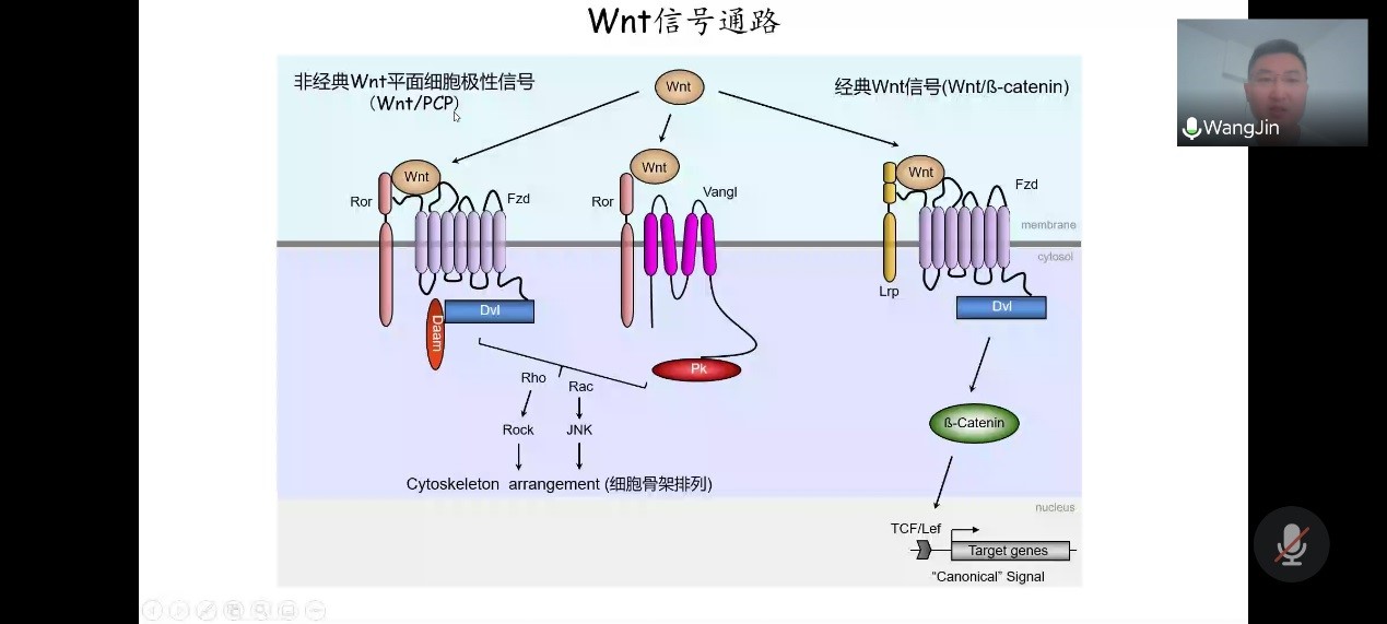 王晋博士报告题目为《内质网相关蛋白降解途径调控Wnt/PCP信号通路的分子机制及在乳腺癌恶化过程中的作用》。在报告中,王晋博士提到:Wnt信号途径包含经典Wnt/β-catenin信号途径和不依赖于β-catenin的非经典信号途径,Wnt/平面细胞极性信号途径就是一条不依赖于β-catenin的信号途径。平面细胞极性在发育过程中对组织形态发生和器官形成过程起到重要作用。该途径的异常会导致一系列发育的缺陷和疾病的产生。研究发现VANGL是构建平面细胞极性的核心蛋白,此次报告详细阐述了细胞内VANGL通过内质网相关降解途径被蛋白酶体降解过程,发现了促进该过程的关键蛋白KBTBD7。通过对TCGA (The Cancer Genome Atlas) 癌症数据库中乳腺癌病人样本的分析发现,KBTBD7对乳腺癌发展具有潜在的抑制作用,并通过构建一系列基因敲除的细胞和小鼠模型对KBTBD7在乳腺癌的增殖和转移过程中的抑制作用进行了深入的研究。